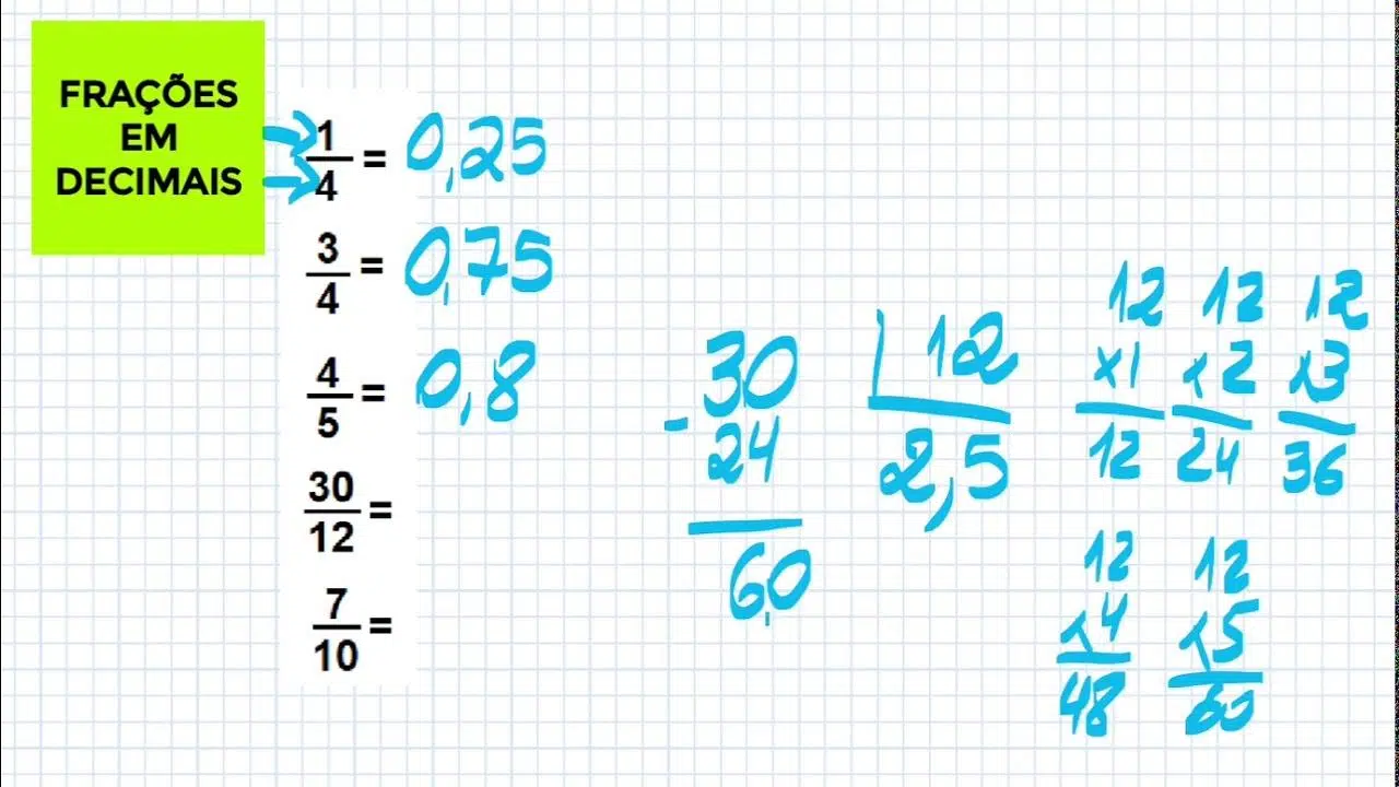 Nos demais casos, a fração vira um decimal finito (se o denominador, após simplificação, tem apenas 2 e 5 como fatores) ou uma dízima periódica. Simplifique a fração (veja frações equivalentes) e analise os fatores do denominador para decidir rapidamente.