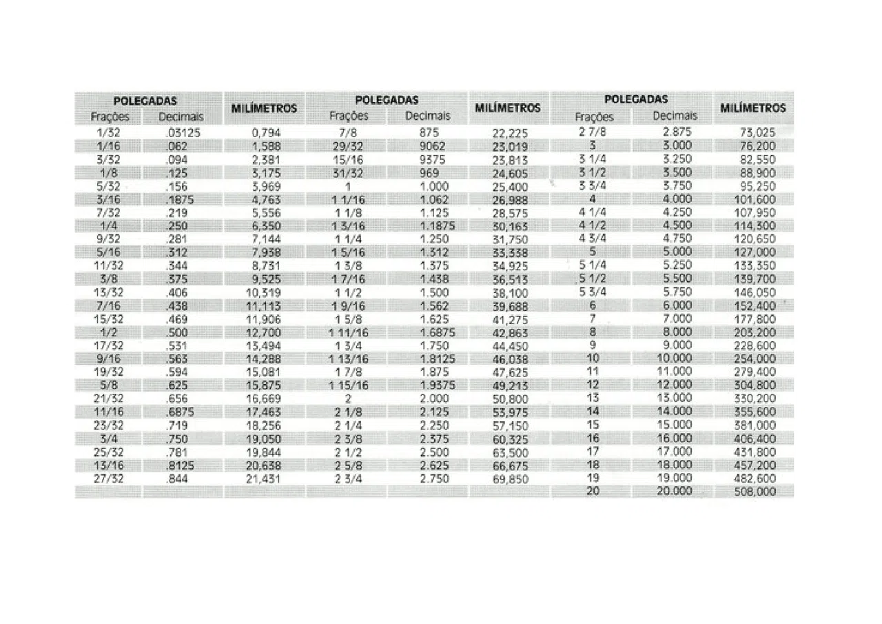 Em torno de 1" (uma polegada): 55/64 = 0,8594"; 7/8 = 0,8750"; 57/64 = 0,8906"; 29/32 = 0,9063"; 59/64 = 0,9219"; 15/16 = 0,9375"; 61/64 = 0,9531"; 31/32 = 0,9688"; 63/64 = 0,9844"; 1" = 1,0000".