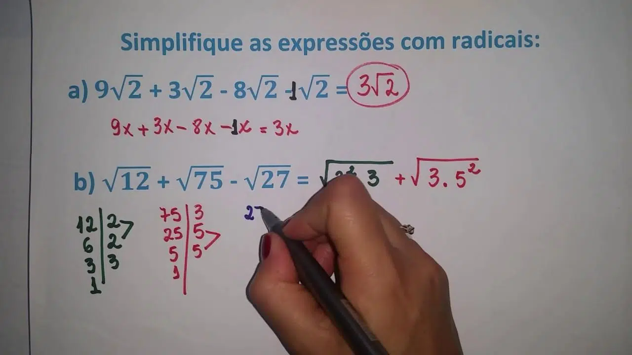 2) Simplificação passo a passo — a) √12 = √(4·3) = 2√3; b) √50 = √(25·2) = 5√2; c) √{243} = √{35} = 3. Fatorar o radicando é a chave.