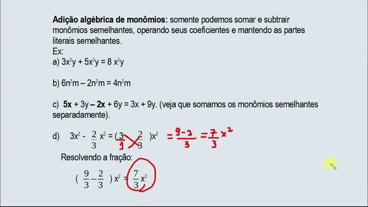 - Somar ou subtrair monômios só é possível quando a parte literal é idêntica; com frações, iguale denominadores antes de operar os coeficientes.