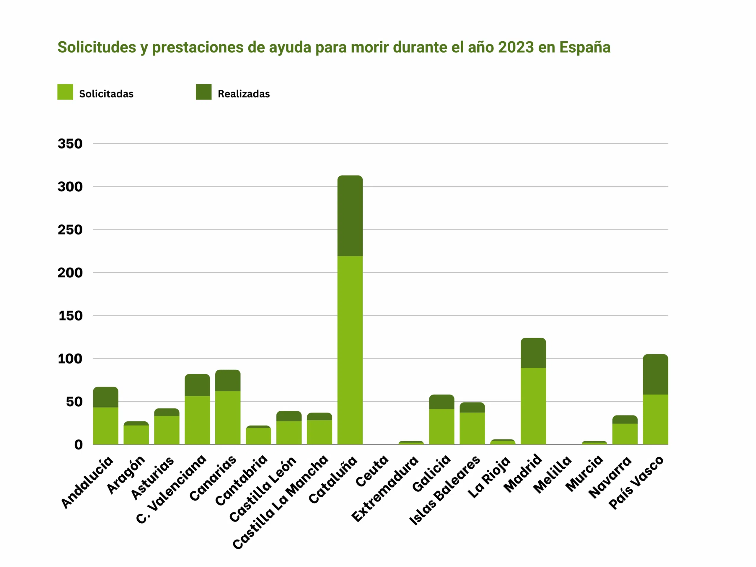 Desde que a LORE começou a ser aplicada até 31 de dezembro de 2023, foram registadas 1.515 solicitações de ajuda para morrer, com um crescimento estável ano após ano tanto nos pedidos como nas prestações efetivamente realizadas. Só em 2024, segundo dados analisados por entidades como o Ministério da Saúde e a associação Derecho a Morir Dignamente (DMD), o número total de processos finalizados aproximou-se de mil, consolidando a eutanasia como parte da carteira de serviços do Sistema Nacional de Saúde.