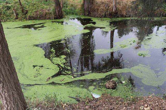 Água poluída na área de Chinampas, Xochimilco, Cidade do México. EmyPheebs [CC BY-SA 4.0 (https://creativecommons.org/licenses/by-sa/4.0)]